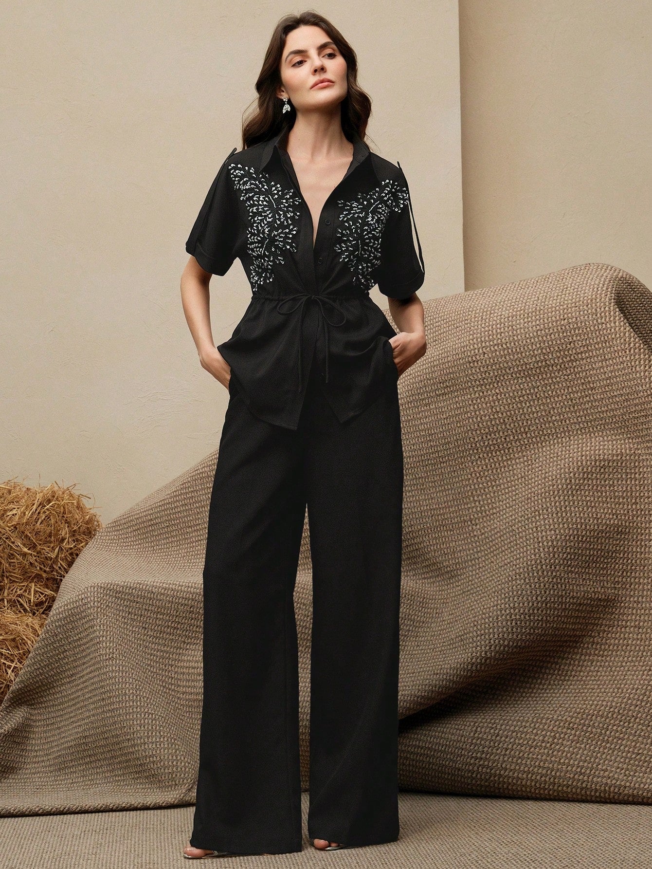 Exude timeless sophistication with this embroidered beige co-ord set. The short-sleeve shirt features intricate embroidery and a cinched waist tie, paired with flowy wide-leg trousers for a refined silhouette. A perfect balance of elegance and comfort, making it your go-to for business casual, formal lunches, or evening events.