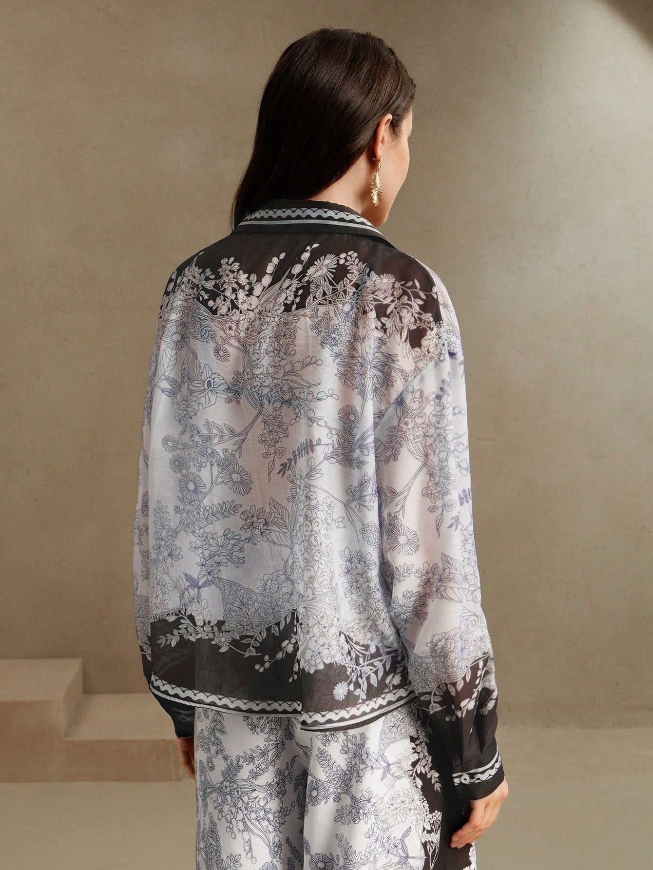 Elevate your wardrobe with this elegant monochrome co-ord set. Crafted from sheer chiffon, the button-down blouse is paired with wide-leg trousers adorned with intricate black-and-white floral motifs. The color-blocked design blends contemporary chic with timeless elegance, making it ideal for evening soirees, vacations, or statement outings.