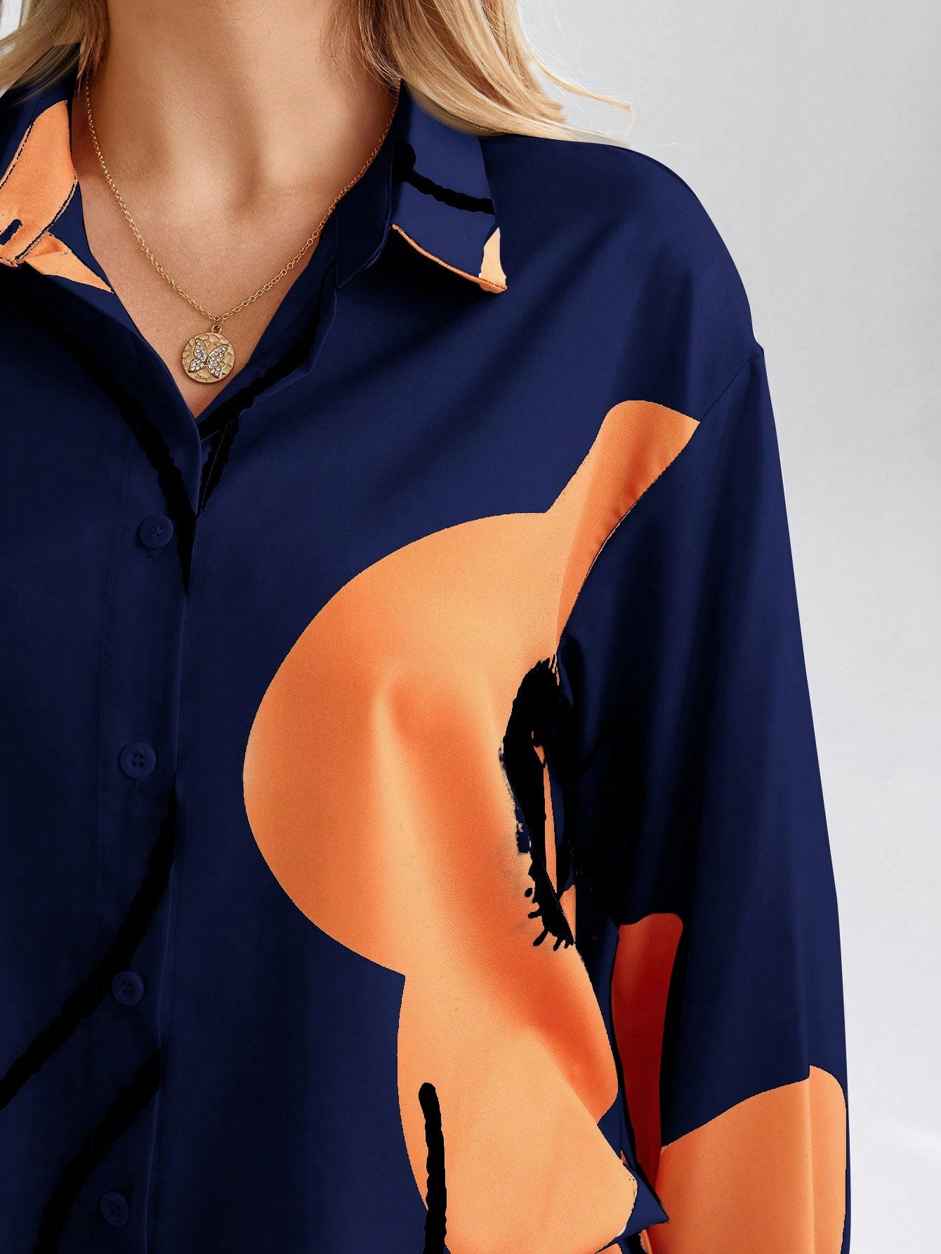 Navy Blue 2pcs Women's Floral Print Long Sleeve Co-ord Set